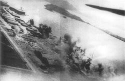 アメリカ軍第58機動部隊の艦載機によって行われた空襲のため、煙を噴き上げる大村の海軍航空廠の格納庫と工場。この攻撃は沖縄攻略戦の2週間前に実施され、特攻用飛行機の製造を阻止することがその目的の一部であった。写真奥には、箕島(現長崎空港)が見える。