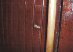 焼夷弾は3ヶ所に落ちた。そのうちの1発が民家の倉庫の壁を焦がし(写真アは、焼夷弾による焦げ痕)、自宅が銃撃された(写真イは機銃掃射を受けたときの弾痕)。他の2発は畑に落ち、たいした被害はなかった。