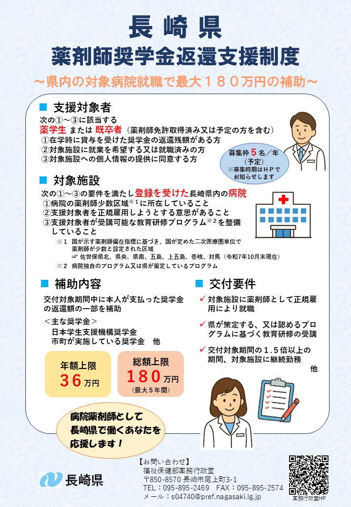 長崎県薬剤師奨学金返還支援制度の令和8年度支援対象者募集期間延長(令和8年3月31日まで)