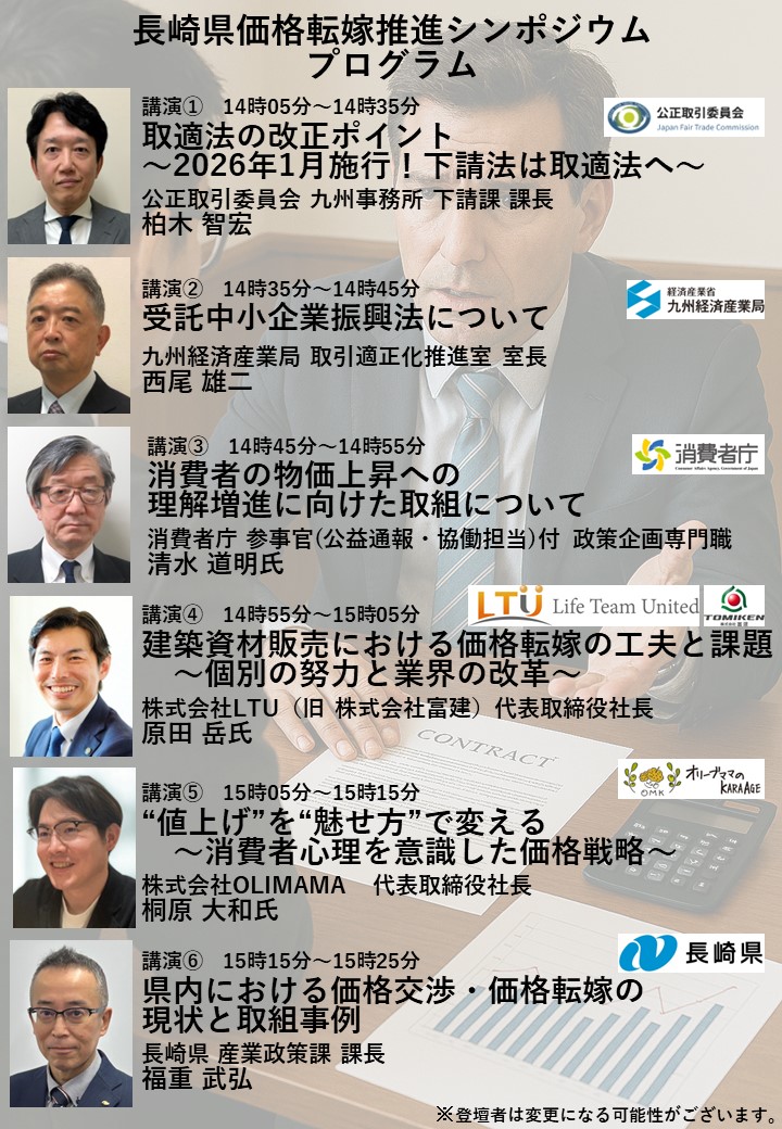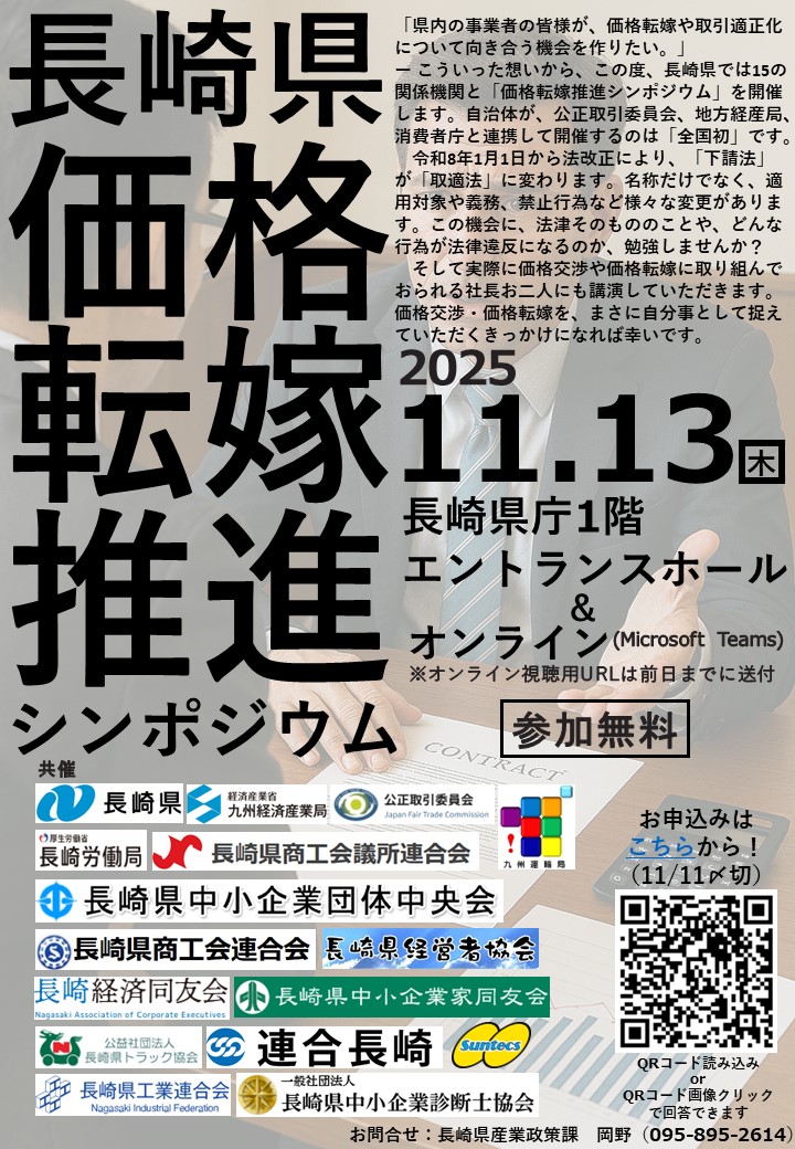 長崎県では、11月13日(木曜日)に長崎県庁1階エントランスホールにて、「長崎県価格転嫁推進シンポジウム」を開催いたします。