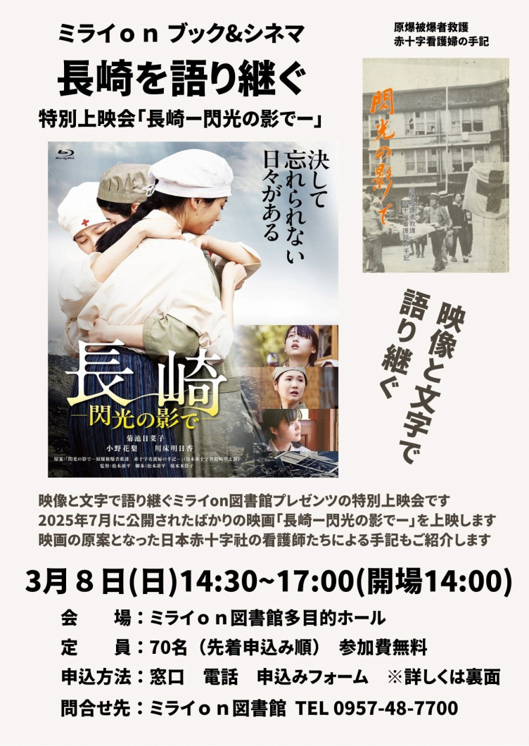 終戦から80年をこえて、平和の尊さを考え続ける第一歩として新企画「映像と文字で語り継ぐ特別上映会」を開催します。上映するのは、昨年度公開された映画「長崎ー閃光の影でー」です。この映画は、日本赤十字社の看護師たちによる手記「閃光の影でー長崎被爆者救護赤十字看護婦の手記ー」を原案にして作成されました。戦後35年が経過した昭和55年に作成されたこの手記は、県立長崎図書館が2冊、赤十字社長崎支部が4部有するのみとなった貴重な郷土資料です。今回は、上映会に参加した後に、手記をデジタル化した資料に触れていただくようにしています。戦争の記憶が風化していく中、いかにして長崎を語り継いでいくのかという課題があります。今回の上映会は、映像と文字で戦争の記憶を継承していくという図書館からの新たな提案です。